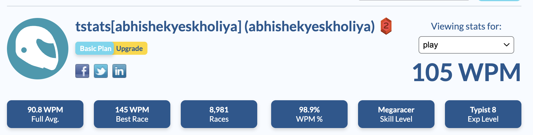I have played over 9000 races and won 3700 of them. My percentile is 98.6%, and I have an average speed of 90 wpm. Would love to race with you. 😉